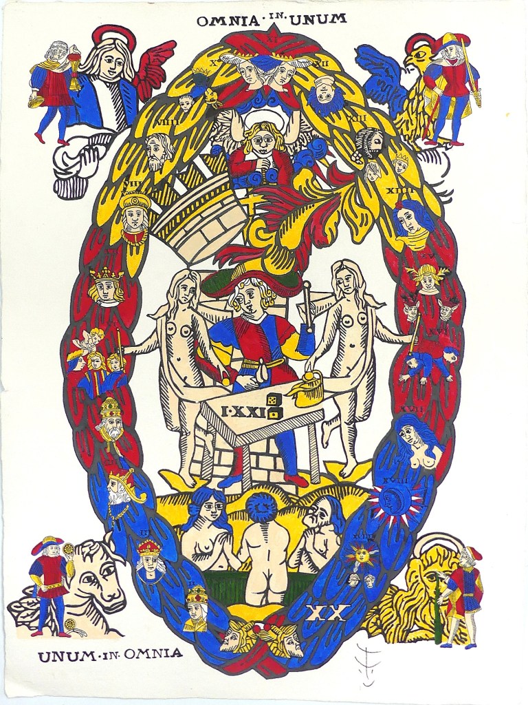 *omnia in unum = 144 // Rayonnement, respiration, inspiration, sel de l’esprit. *+ unum in omnia = 288 // Retournement intérieur, opération du saint esprit, embarquement pour Cythère.
