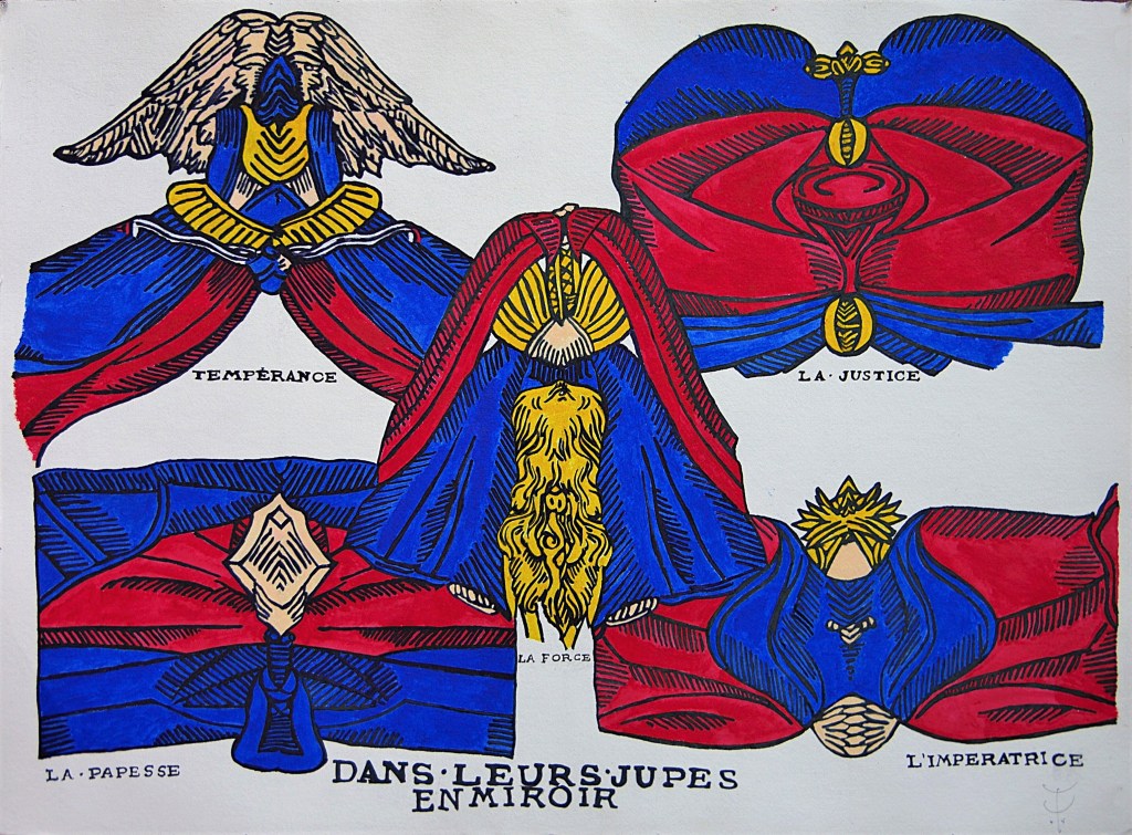 Puisqu’ISIS l’initiatrice déesse Nature est celle dont « nul mortel jamais n’a soulevé le voile. » devant les cinq dames habillées du Tarot vient la curiosité de soulever leurs robes pour voir. Oui mais comment ?