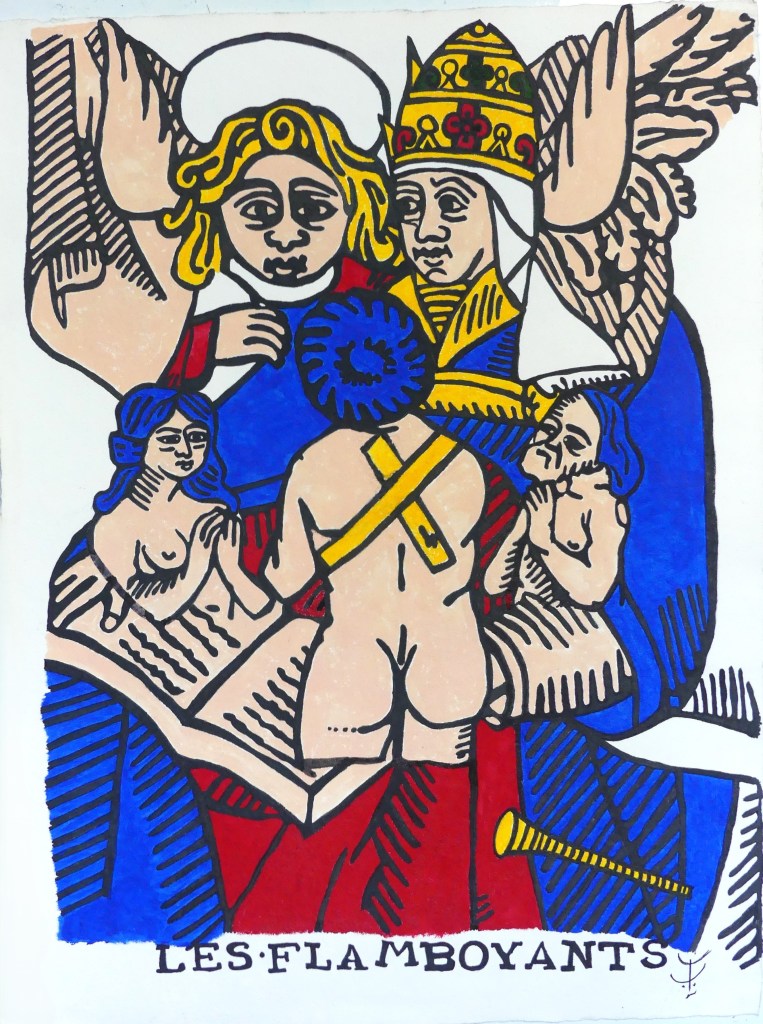 Elle, unie à la terre par la plante de ses pieds et ouverte au ciel par ses cheveux bleus porte l’eau de vie*féconde et fertile. Lui, sacerdotal à souhait, comptant sur ses doigts l’ordonnance du monde par les nombres, porte la parole de vie* qui conjugue l’être humain à la terre et l’univers. Entre eux, un ‘’petit manger’’ concocté par des cuisiniers diablotins, mijote sous la chaleur de la Lumière descendue des limbes de la Maison Dieu.