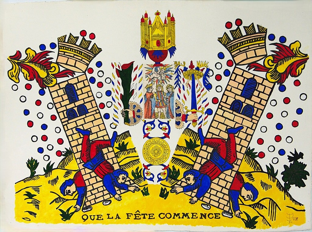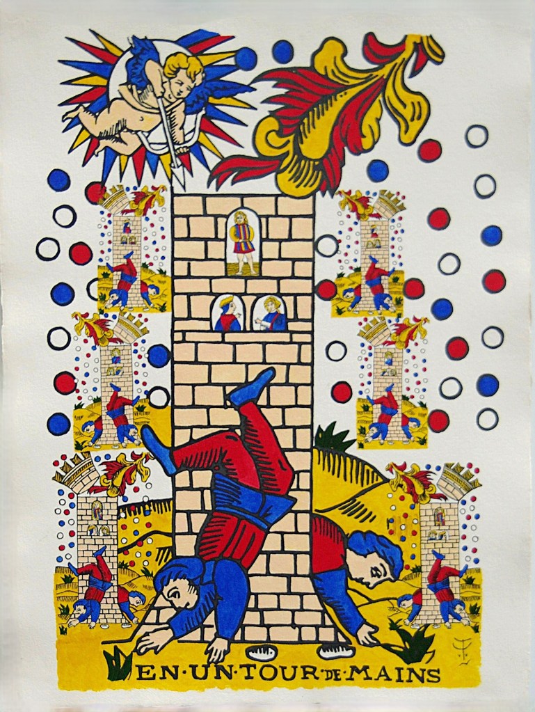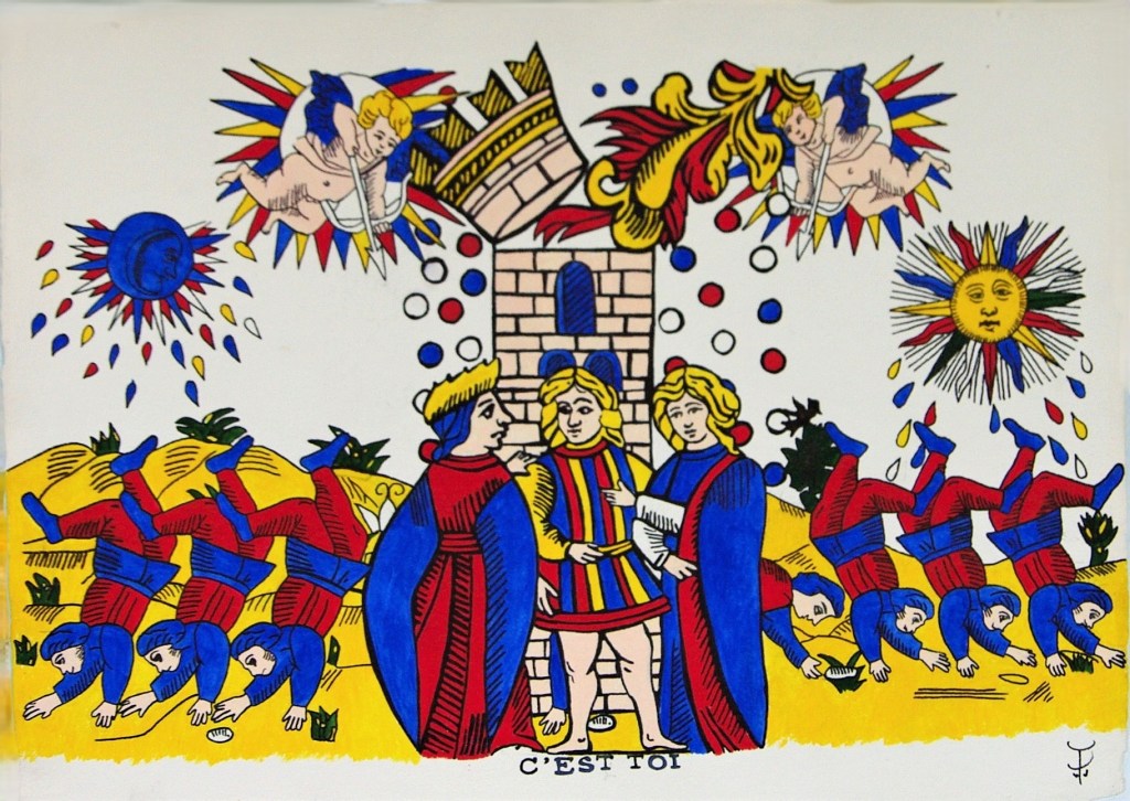 Lors d’une exposition un enfant nous expliqua que dans la tour il y avait un roi et que les deux bonshommes faisaient des acrobaties pour faire rire le roi. Dit autrement la carte de La Maison Dieu symbolise l’être de chair- la tour- qui reçoit la lumière céleste et se réjouit de la vie.