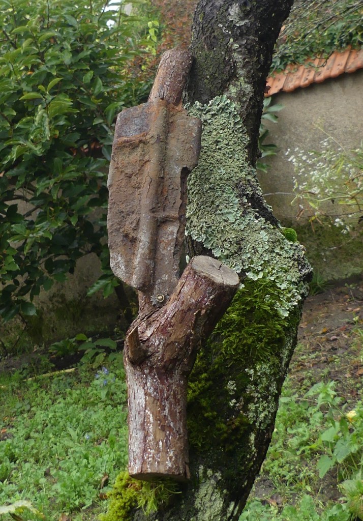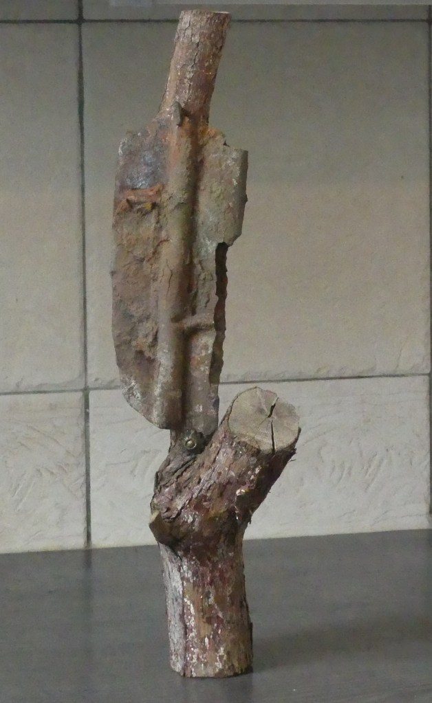 Cette vision° d’Ogoun Ferraille, maître haïtien du feu et du fer, guerrier infatigué détenteur des pouvoirs des esprits est née du bois d’un rosier Pierre de Ronsard et d’un fragment d’acier d’une bande de roulement de la roue d’une charrue ayant longtemps séjournée dans la mer.