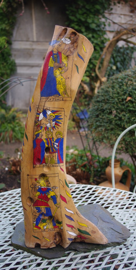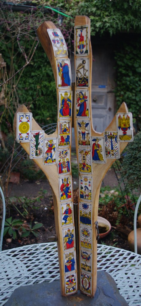 Comme la vitrine présente onze compartiments avec deux espaces chacun, j’ai pu y installer les vingt-deux cartes majeures qui remplissent ainsi à merveille les onze étages s’y plaçant selon leurs affinités de complémentarité. .