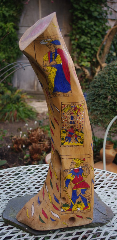 Avec son bâton qui lui tient la main* il tient en échec et mat les pièges des peurs, murs et fossés dressés sur son chemin, et suit sa voie : conjuguer son verbe être aux vingt et une autres lames du voyage en soi qu’est le TAROT.