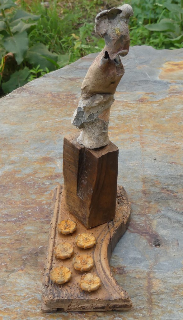 (Sujet : (Matériaux du début du XVIIII ème siècle)tuyau en plomb, brique, ciment, socle : fragment de corniche d’armoire, pied : fragment de tête de lit, décor floral : boutons de manteau.)