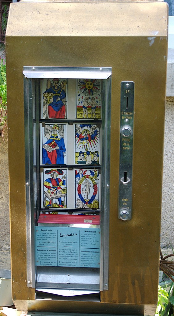 Cette mécanique a une démarche subtile, basée sur des principes de poids, mesure, justesse : une pièce d’un franc d’exactement six grammes, mise dans la machine, enclenche le déroulement d’un rouleau par pression du pouce sur le bouton inférieur du clavier, puis par relâchement du dit pouce, le désenclavement l’extraction, le glissement puis la prise, le tirage d’une puis d’une autre carte choisies en pensant à ceux : parents, grands-parents, enfants, amante, amant, collègue(s) de travail ou voisin voisine à qui on va bien évidemment les envoyer.