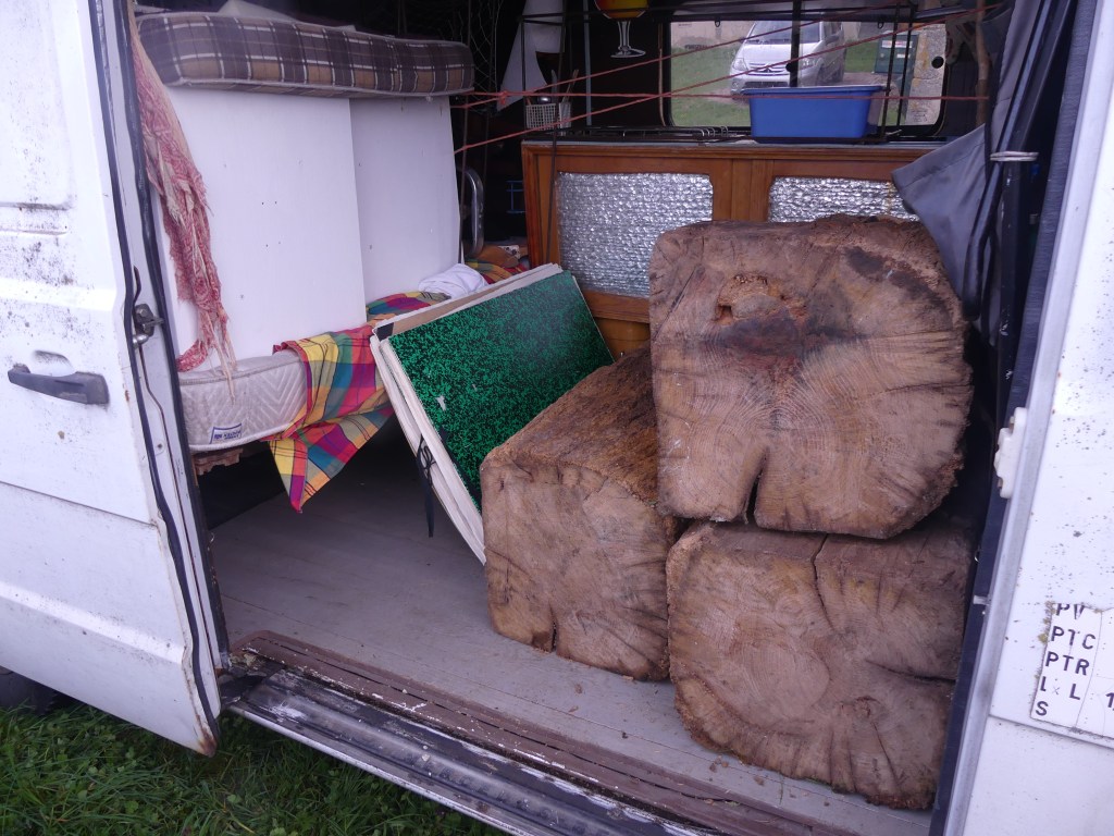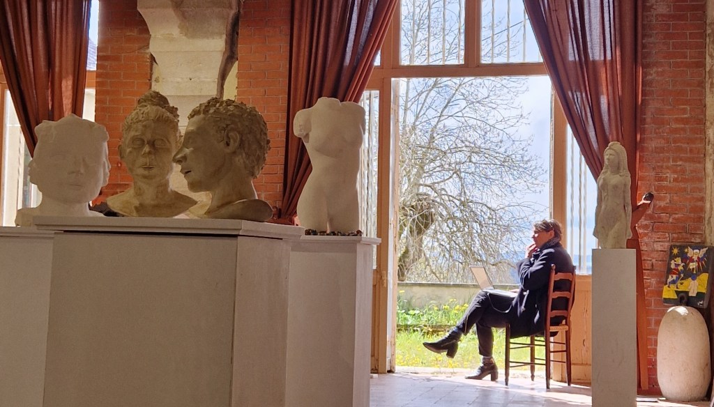 Le 23 avril, c’est aussi trois heures de route depuis Orléans avec des sinuosités entre blé tendre et colza en fleurs d’or, des bourgs endormis dans le soleil d’avril, de l’eau le long des chemins dans les creux des vallées, et la musique de l’Attirail (Dancings des bouts du monde) sur laquelle je chante à tue-tête par-dessus le moteur de mon vieux Sprinter. A peine arrivés nous chargeons les trois véhicules de nos œuvres : de mes deux cartons à dessins calés entre des socles de chêne jusqu’à la sirène de Loire de Virginie,