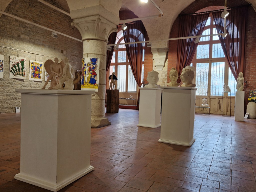 Et puis la classe de l’école qui jouxte la salle : une douzaine d’enfants de 3/4 ans à 8/9 ans, leur institutrice (du latin instituere : qui met sur pied, bâti) et une accompagnatrice. Ces enfants (infans en latin : dénué de parole !) s’extasient devant les sculptures, Antonin Artaud fait peur à certains, la tête à treize visages est dévisagée avec curiosité, la conversation d’Eros et de la cantinière interroge, de quoi parlent-ils cet ange tout nu et cette femme si calme ? et la meute de chiens d’Actéon… Puis ils en viennent aux peintures et la maîtresse, qui m’a emprunté mon jeu, distribue les cartes en proposant aux enfants une chasse aux trésors :