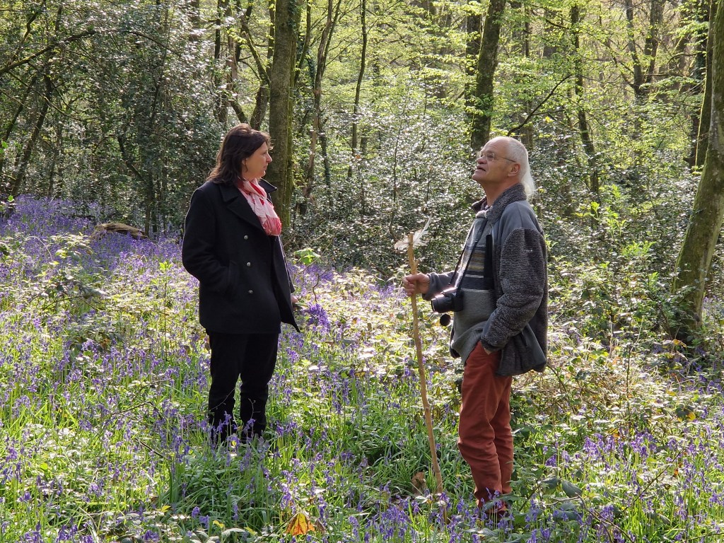 *Un matin, avant de prendre la route, balade dans le petit bois derrière : descente par un chemin sous haie, entrée par un passage de chevreuil dans le bois et immersion dans un lac de jacinthes matinales, ensoleillées et odorantes. Marcher dans les pas de l’autre pour perturber a minima leur matinée, s’arrêter devant des arbres couchés moussus, ensemencés de fougères, imprégnés d’eau de nuit, entendre des oiseaux matinaux jusqu’à plus soif d’oreille et revenir chacun un petit bouquet vert et bleu entre doigts et paume pour fleurir la salle, c’est ainsi.