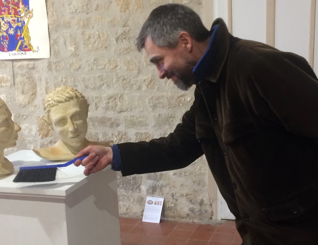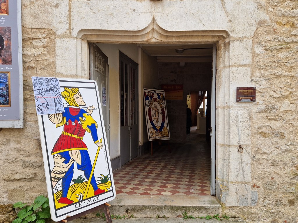 Et Pierre, enthousiaste, qui se fait photographier dans l’ombre du Mat sous le porche, réalise une courte vidéo qu’il envoie à son réseau. Il revient le lendemain pour m’annoncer que cent personnes ont ‘’cliqué dessus’’. Passionné par le Tarot et aussi écrivain il est revenu pour m’offrir son roman policier dont le titre est évocateur : La Lemniscate. Lui aussi attend de moi que je trouve comment reproduire mes œuvres…