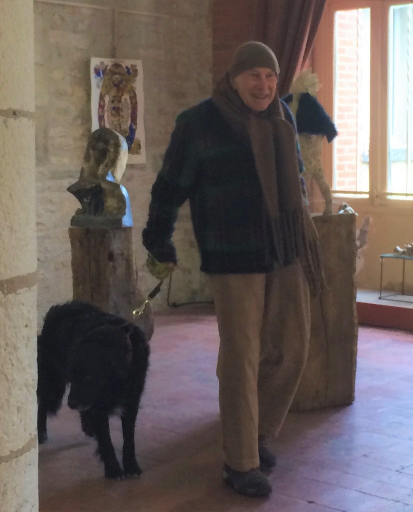 Frans, ce vézelien de grande taille, accompagné de Bô son chien bouclé noir. Un Mat en pays de connaissance, détaillant une à une mes planches puis qui, ayant fini son tour de lâmes, vient vers moi pour m’acheter Se Rencontrer ‘’en plus petit si possible’’ parce qu’il n’a plus beaucoup de place sur ses murs. Je ne vends pas ce qui est exposé mais promis je trouverai un moyen de répondre à sa demande. Revenu le lendemain il nous écrira une dédicace mémorable : »Franchement, vous -les trois- sont, selon moi, les vraies artistes’’, le «e» à vraies m’a particulièrement plu puisqu’il signait notre androgynie artistique et créatrice.