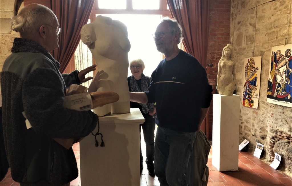 Et dans la salle ? Pour Stanislas et Virginie, comme j’étais souvent avec mes propres curieux, à l’écart de leurs conciliabules avec leurs visiteurs, je ne saurais qu’en dire sinon qu’il y avait beaucoup de sourires, de longues stations devant telle ou telle sculpture, des doigts qui montraient, des bouches qui disaient leurs plaisirs (bien lisibles dans le livre d’or). Quant à moi ce fut un bonheur de réaliser que ce dans quoi je chemine depuis longtemps devenait visible aux yeux d’autrui.