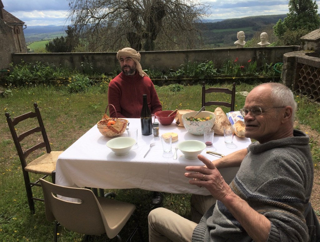Et ne pas oublier les repas sur la terrasse de la salle avec qui se trouve là, vivres tirés du sac ou concoctés le matin (souvenir d’une compotée de légumes) ou à la table de la maison à dix ou six ou trois. C’est un partage qui lie la sauce entre nourritures terrestres et célestes : poulet gros comme un gascon cuit lentement dans une cocotte, un comble pour un coq, riz arrosé de coulis de tomates ou ‘’petit manger’’ de mouton cuit tout doux avec un bocal de tomates, des oignons, le tout revenu dans l’huile d’olives, arrosé d’une eau qui n’a pas besoin de bouteille (en plastique) et du Corbières, bien élevé, du Domaine de Sainte Juste à Durban.