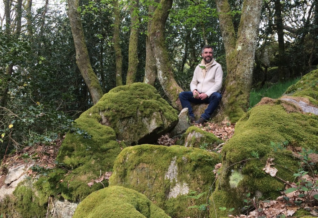 Après un retour tout en méandres sur de petites routes nocturnes, un repas à trois dans une maison endormie le matin suivant nous partons, guidés par le maître des lieux jusqu’au Mont Premiux, son hermitage dont il nous fait découvrir des trésors : une nappe de muguet, un creux dans une fourche de chênes son trône, un amas rocheux où Stanislas nous explique comment la lave est montée (jusqu’au ciel ?) pour ensuite redescendre en se séparant en roches qui selon leurs vitesses et leurs températures devinrent ces chaos où des traits, des couleurs, des failles, des différences de toucher nous font naître à de nouvelles visions de notre monde : Stanislas est géologue.