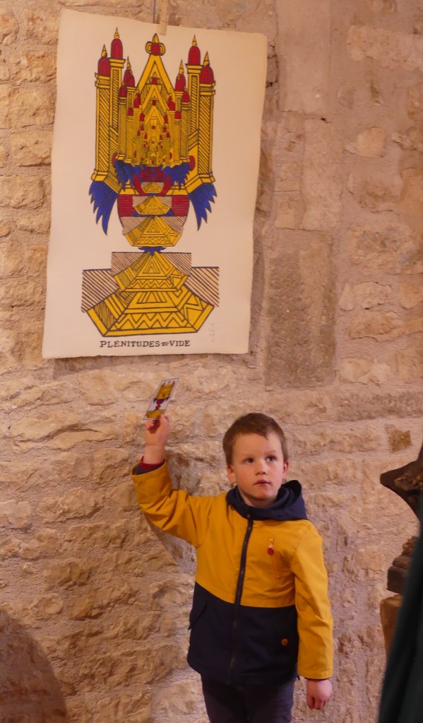 Stanislas installe la blancheur de ses pierres et terres à côté des modelés aux couleurs allant du grège à l’ivoire de Virginie, tout cela ceint des couleurs du Tarot. Il est 15 heures, un café ? Mais tout est fermé. Carpe diem ? Juste en face la propriétaire de l’Hôtel des glycines (l’une d’elles fleurit depuis deux siècles) très gentiment nous offre le café et ainsi nous fait découvrir qu’ici, à Vézelay, »si tu demandes il te sera donné. »(Matthieu 7 : 7) !