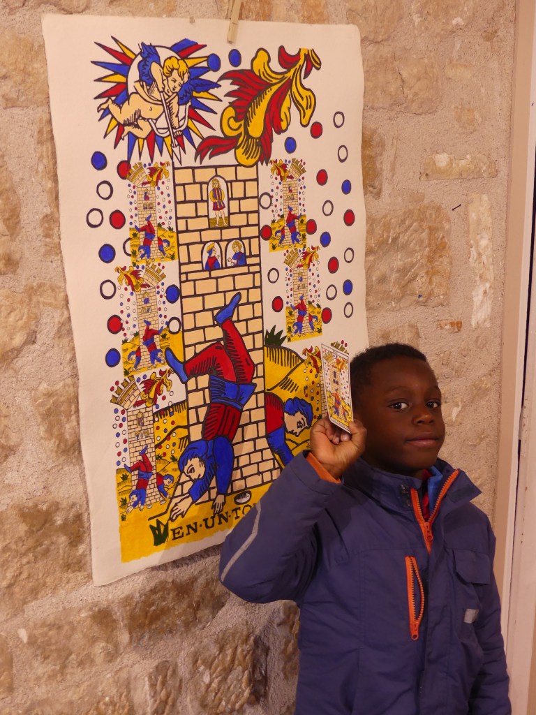 associer la carte qu’ils ont en main à une des planches. Ils courent, trouvent et montrent fièrement les accointances qu’ils ont créées. Ensuite ils font le tour, les yeux pleins de couleurs, des dessins-desseins qui les font rire, rêver, parler et, lorsqu’ils arrivent devant ‘’En un tour de main’’ présentant une Maison Dieu fleurie de petites tours et d’amoureux, l’institutrice demande : « Que voyez-vous ?» Réponse : « Une tour et s’il y a une tour il y a un roi ». « Et que font les deux hommes en bas ? » « Ils font rigoler le roi ! ». C’est gagné ! Cette interprétation de la relation entre l’être humain et son créateur -ce qui anime l’univers- qui dit que nous sommes là pour apporter le rire, la joie, le plaisir, le bonheur (pensées déjà présentes chez Epicure) je ne l’ai trouvée nulle part. Et même, cette carte souvent mal vue comme étant symbole de chaos, catastrophe, invite les minuscules (à l’échelle des univers) rois-moi que nous sommes à rire de nos galipettes-agitations pour devenir sage (est sage celui qui connait ses désordres et les gère).