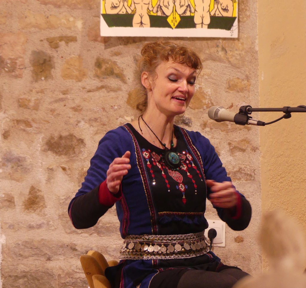 Le vendredi soir, Lily Jung est venue nous apporter l’air du Monde, des mondes par la plus simple présence de la voix, sa voix. En concert, Lilly porte ces chants avec toutes leurs humanités en donnant aux sons des vibrations qui sonnent, réfléchissent en nous et ainsi deviennent les échos de nos émotions. Son tambour chamanique, compagnon de mesure, dont la « peau » est une toile de yourte , fuse et diffuse des vibrations éthériques sur lesquelles monte sa voix tisserande d’unis vers…